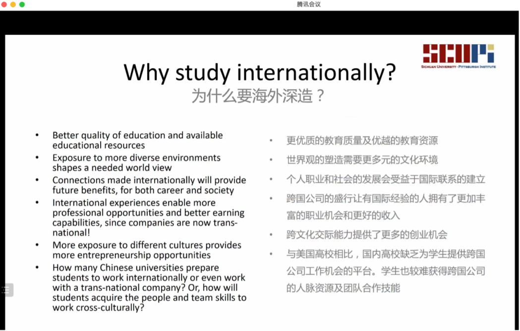舒曼教授特意分享了三位曾参加2+2联合培养的优秀匹院学生。首届毕业生李平天,本科毕业后在俄亥俄州芬利的库珀轮胎和橡胶公司担任产品设计工程师,“Leo在学校非常活跃,参加过很多校园项目,是SCUPI学生里只完成本科学业就能很成功的一个例子”,舒曼教授谈到。
