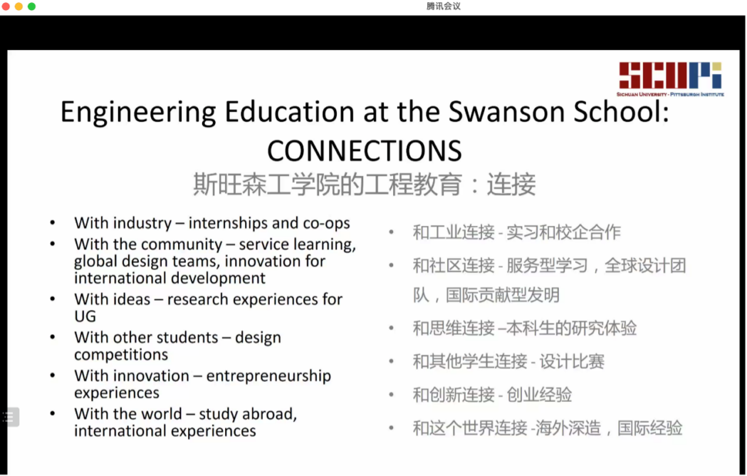 匹兹堡大学斯旺森工程学院能够为培养创新性、国际化的工程技术人才提供优势资源。“在斯旺森学院,大约一半的学生都具有某种类型的国际经验,因为我们的教育重点关注连接性(connection)”。他详细阐述了有关工业、社区、思维、学生、创新和世界六方面的连接,“学生通过实习和合作项目与行业连接,参加服务项目、成为全球设计团队成员等和社区连接,参加设计竞赛与其他学生连接,借助创业和创新连接,以及通过出国留学与世界连接。”