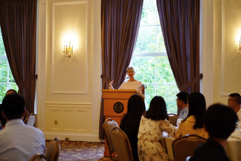 随后,匹兹堡大学斯旺森工学院副院长Mary Besterfield-Sacre上台致辞,Mary Besterfield-Sacre院长用几个轻松有趣问题,了解到大多数同学都是第一次出国,对于同学们第一次走出国门就选择了来到匹兹堡大学访学,她感到非常高兴,希望大家在匹大学习期间能学有所获,每天主动给自己一些“挑战”,做一些没有尝试过的事情,走出舒适圈,以此丰富自己在夏令营的学习体验,激励自己不断学习和成长。