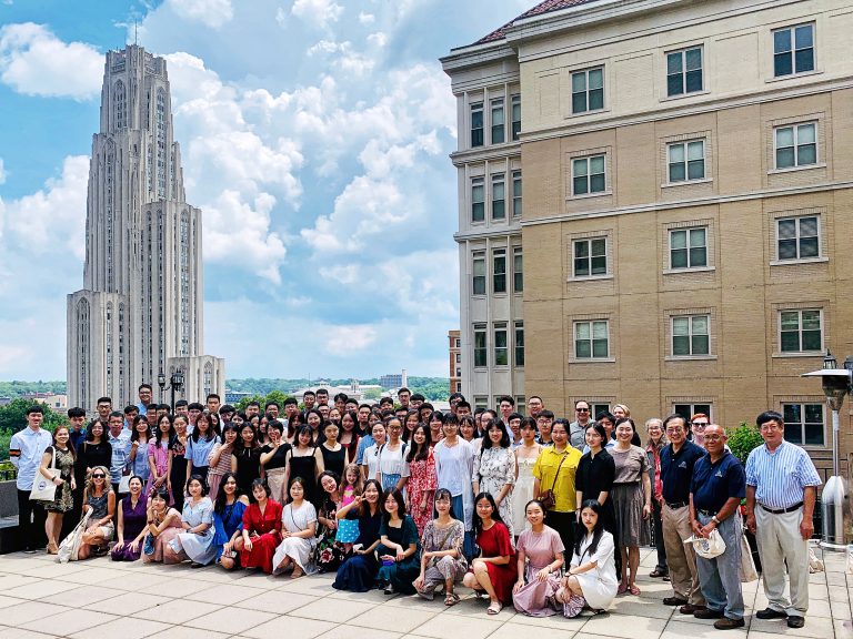 Mary Besterfield-Sacre院长致辞结束后,大家开始享用丰盛的自助午餐,同学们积极和匹大的师长们交流沟通,现场气氛轻松活跃。最后,大家以匹兹堡大学著名的全美最高的校园建筑——学习大教堂(Cathedral of Learning)为背景合影留念,正式开始了为期近3周的美国校园的学习体验。