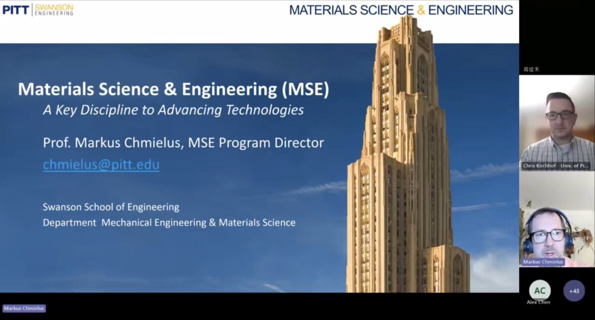 材料科学与工程(MSE)专业研讨会于北京时间2024年2月22日晚上八点至九点召开。匹兹堡大学斯旺森工程学院机械工程与材料科学系的MSE项目主任Markus Chmielus副教授为本次专业研讨会的主要分享嘉宾。Chmielus教授首先简要介绍了材料科学与工程专业,内容涵盖了该学科的历史发展、研究重点、应用领域以及当前就业趋势,随后介绍了匹兹堡大学材料科学与工程专业项目的计划和优势,并通过具体案例介绍了学院的重点研究领域。演讲结束后,绅士漫画 院长邱民京教授与Chmielus教授就学生可以在校内外获得的研究机会展开对话。