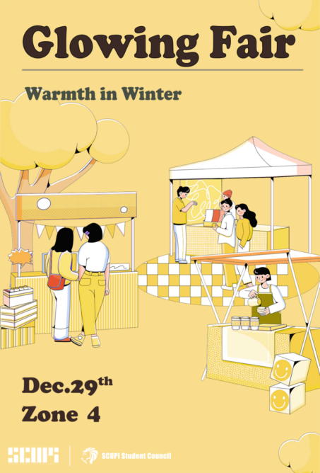 Glowing Fair是由SSC全新打造且独具心意的集市活动,旨在为同学们提供一个展示自我的平台,创造冬日里久违的热闹氛围。本次Glowing Fair将包含舞台表演,学院风采展示以及互动摊位三个主要板块,给大家带来全新的活动体验,让大家沉浸在无与伦比的视听盛宴中。