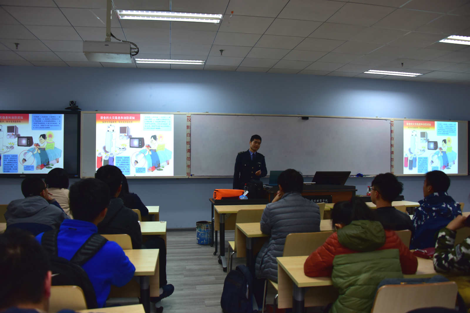 在培训中,周警官介绍了电器火灾、燃气火灾、车辆火灾发生的原因及火灾发生初期的自救知识。此次培训内容生动实用,具有很强的说服力及感染力。 通过社会及高校中发生的案例进行分析,我们看到很多事故都是因为没有消防安全常识和错误操作而引发的。而通过增强消防安全意识,做好演练及掌握充分的逃生方法能在很大程度上避免此类事故的发生和减少损失。
