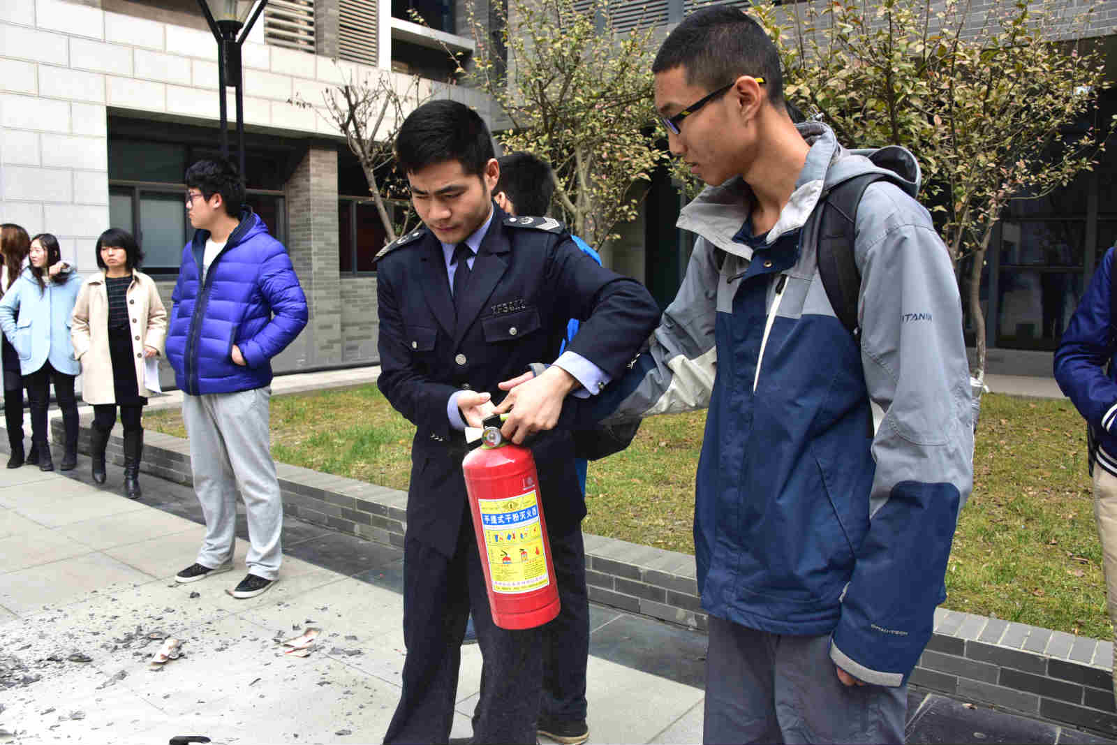 讲解完后,周警官在学院楼下为同学们现场演示灭火器的使用方法,同学们也进行了实地演练。
