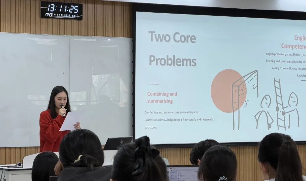 During the first semester, Jiachen Sun, from the Class of 2028, faced two core challenges: a lack of systematic knowledge frameworks and difficulty adapting to a fully English-taught environment. During the second semester, she proactively built learning frameworks and enhanced her English ability. She organized knowledge with mind maps and accumulated vocabulary daily, which significantly improved her knowledge structuring and English proficiency. She emphasized that the key to progress lies first in calmly identifying problems, then establishing a closed-loop cycle of “planning—reviewing—mind mapping” to form a solid knowledge system. For English learning, she encouraged active participation in group discussions and the courage to ask questions in class or seek help afterward, thereby quickly adapting to the fully English-taught pace.