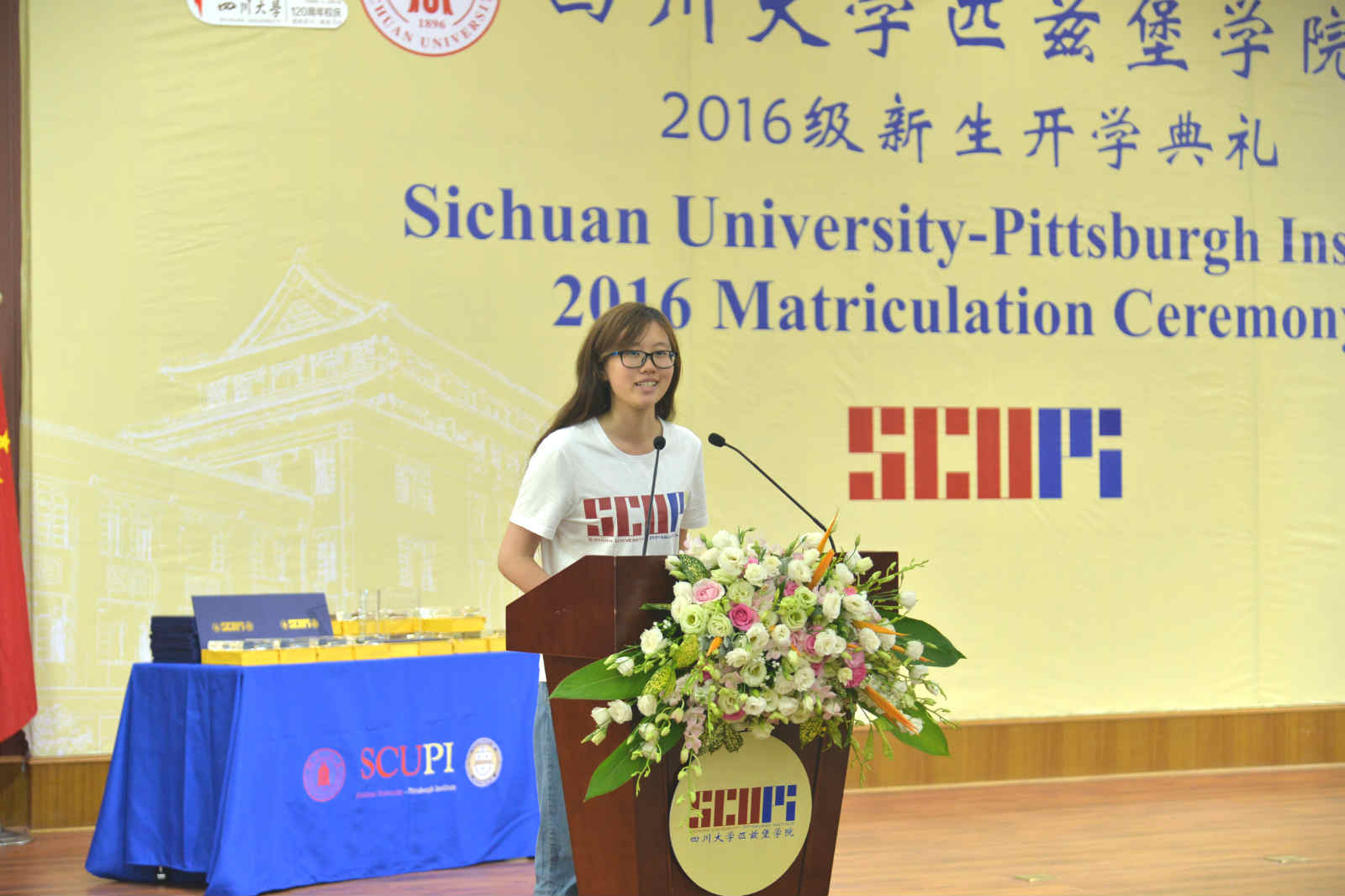 On Sunday, September 18, 2016, 2pm, Matriculation Ceremony for class of 2016 was held at International Conference Hall, third floor, Sichuan University – The Hong Kong Polytechnic University, Institute for Disaster Management and Reconstruction (IDMR). Gerald D. Holder, the Dean of Swanson School of Engineering, Xie Heping, the President of Sichuan University, Li Guangxian, the Executive Vice President, Bu Hong, the Vice President,Yan Shijing, the Vice President, Minking Chyu, the Dean of Sichuan University – Pittsburgh Institute (SCUPI), Gretchen Kalonji,Dean of IDMR, Michael Reed, the Associate Dean of SCUPI attended the ceremony. Representatives from other departments and schools, all faculty, staff, and sophomore students from SCUPI, and over 100 parents attended the ceremony to celebrate the second class of 160 students’ beginning of their academic journey at the SCUPI. The Executive Vice President of Sichuan University, Li Guangxian chaired the matriculation ceremony. President Xie gave a welcome speech to congratulate the class of 2016 students for becoming a SCUPIAN, and he also extended his gratitude to Chancellor Gallagher and Dean Holder for their effort and support on the Institute. He expressed his expectation to class of 2016, be independent, be responsible and to expand international outlook.