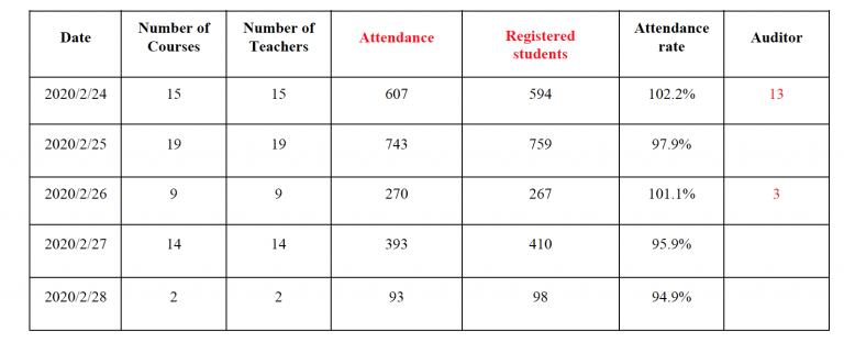 Considering the number of online classes, participants, and the capacity of the Internet, Fred, an IT team member, distributed all courses into five different servers, namely class2016, class2017, class2018, class2019, and overseas, which guaranteed the stability of online teaching. During the first week of online teaching, the IT team, the Academic Affairs team, and Student Counselors were put on standby for a better service of distance learning.