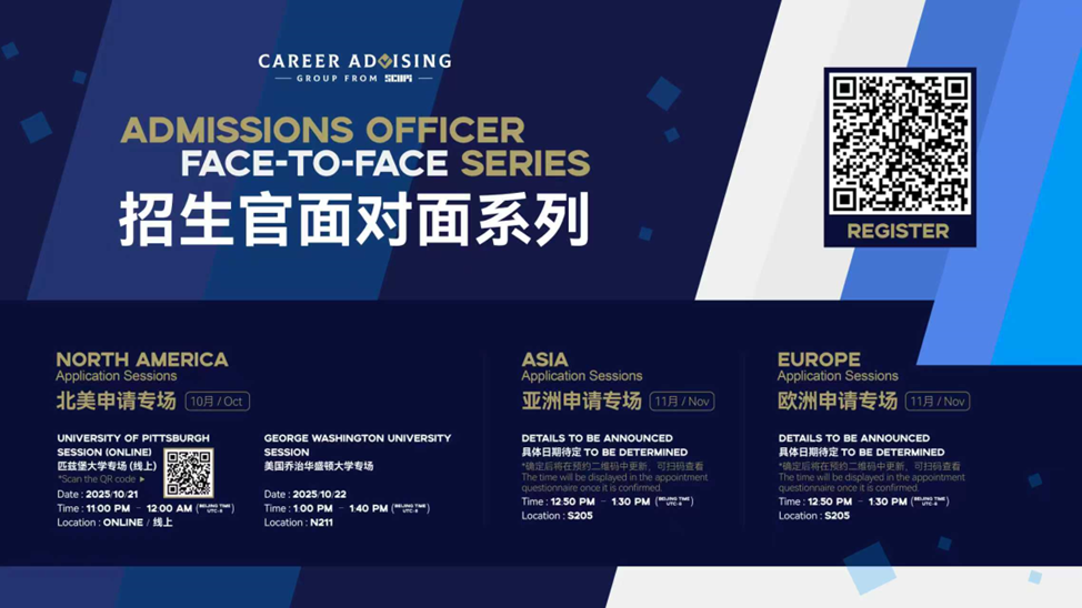 In line with our commitment to global education and to support students in realizing their dreams of studying at world-leading institutions, the Career Advising Group of Sichuan University-Pittsburgh Institute (SCUPI) will launch the “Face-to-Face with Admissions Officers” series once again in October 2025. This event will bring together admissions officers from renowned universities across North America, Asia, and Europe, providing students with a valuable platform for direct dialogue and access to first-hand admission information.