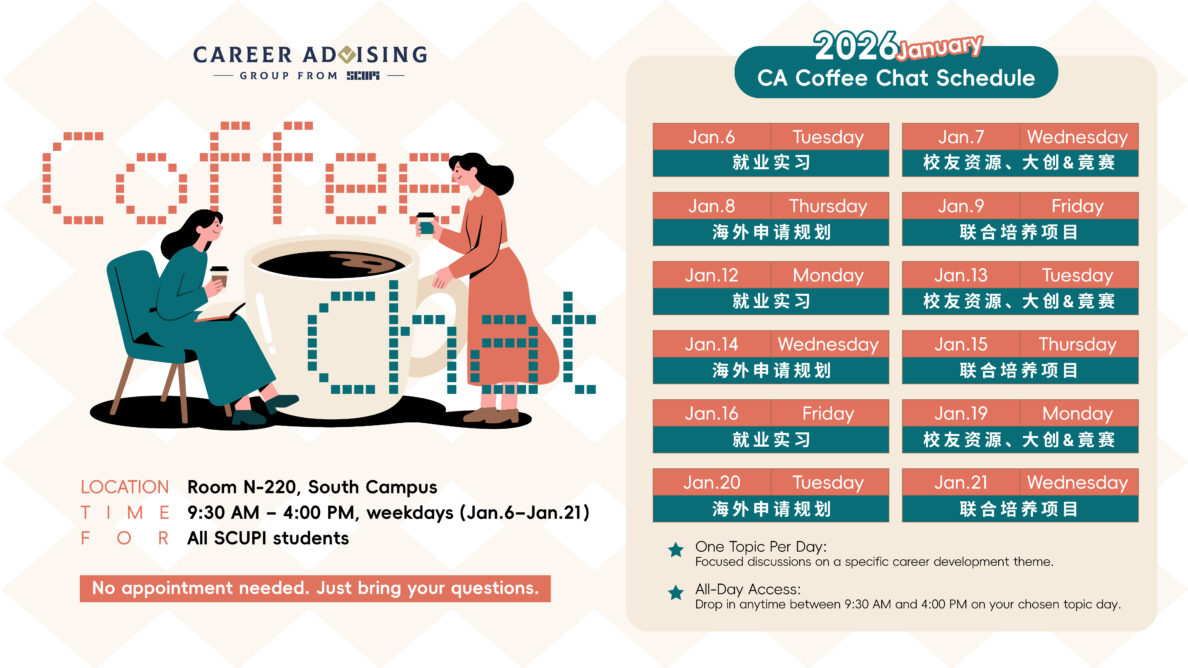 Start your new year with a plan. Join the Career Advising Group (CA) at SCUPI for the Finals Planning Hub: Coffee Chat With CA, held weekdays from January 6 to 21, 2025.