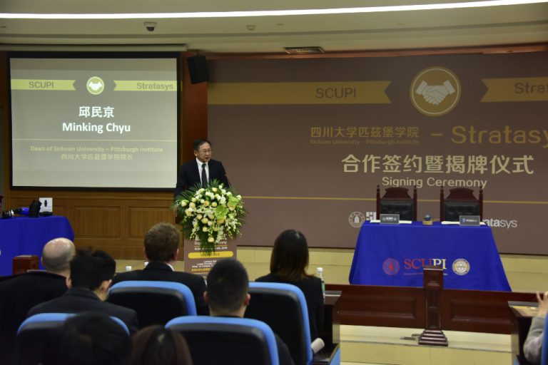 On March 6, 2019, the Sichuan University – Pittsburgh Institute (SCUPI) – Stratasys Signing Ceremony was held at the Lecture Hall, Law School, Jiang’an Campus, Sichuan University (SCU).
