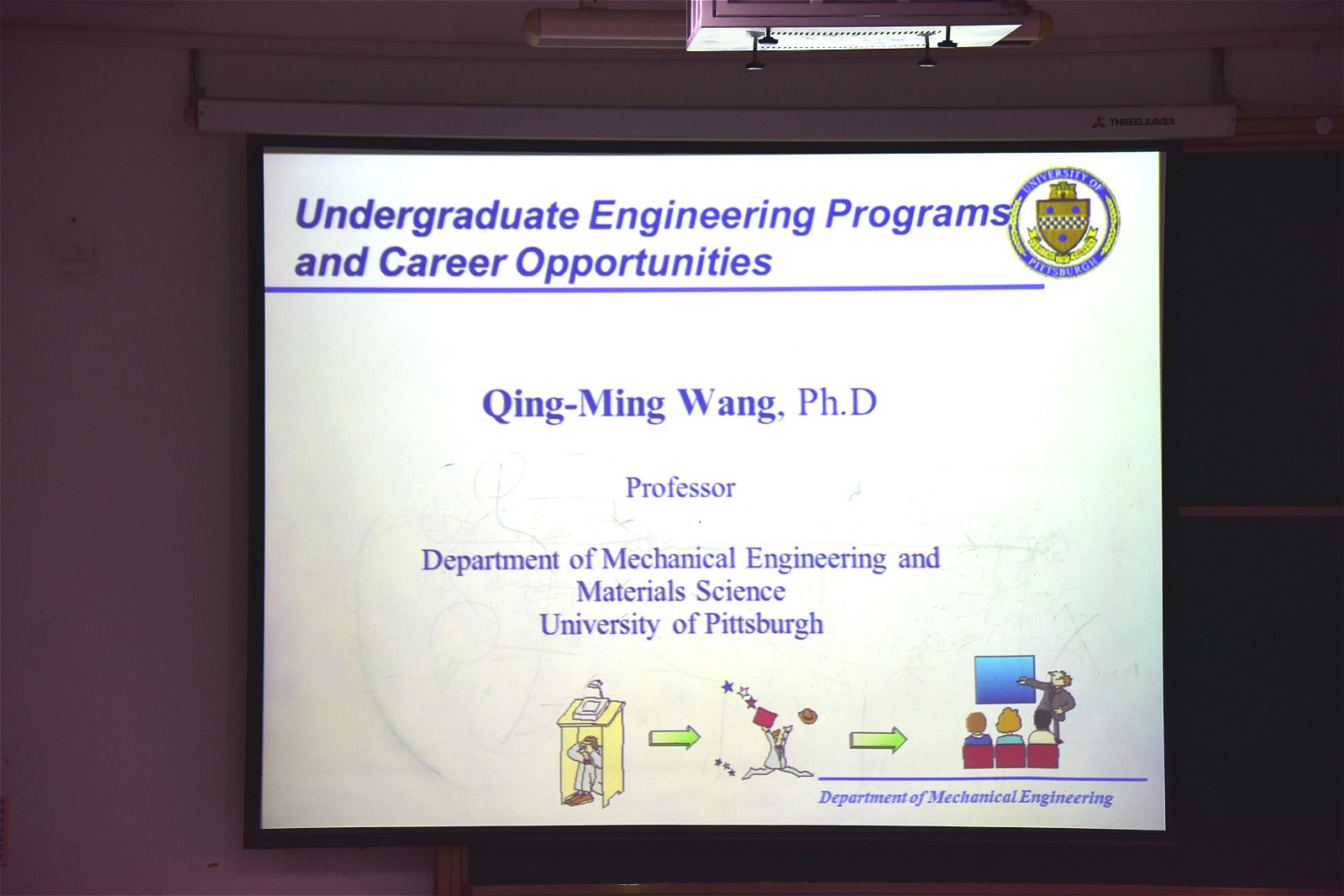 On Friday, March 10, Sichuan University-Pittsburgh Institute welcomed Dr. Qingming Wang, professor and director of the Graduate Program, Department of Mechanical Engineering and Materials Sciences, at University of Pittsburgh. Professor Wang gave a lecture about Pitt’s undergraduate engineering program and career opportunities. SCUPI freshmen, as well as professors and staff, attended the lecture. Dr. Wang delivered five main points:• What is engineering?• What do engineers do?• How do I become an engineer?• What are Mechanical Engineering and Material Science Engineering?• What is the mission of the Swanson School of Engineering at Pitt?