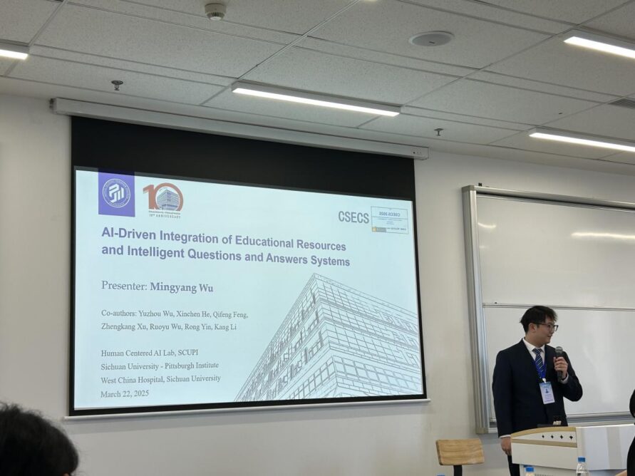At this conference, a cross-disciplinary team of faculty and students from four different majors at Sichuan University – Pittsburgh Institute (SCUPI) successfully presented their research paper “AI-Driven Integration of Educational Resources and Intelligent Questions and Answers System.” This team, consisting of members from various disciplines, including Industrial Engineering, Computer Science, Electrical and Computer Engineering, and Materials Science & Engineering, included undergraduate students Mingyang Wu (Class of 2023), Yuzhou Wu (Class of 2023), Ruoyu Wu (Class of 2023), Xincheng He (Class of 2024), Qifeng Feng (Class of 2024), Zhengkang Xu (Class of 2024), along with faculty members Rong Yin (Assistant Professor in Industrial Engineering) and Kang Li (Associate Dean for Research). Under the careful guidance of faculty from Industrial Engineering, this interdisciplinary collaboration fully demonstrated the unique advantages of SCUPI’s cross-disciplinary approach that integrates medical and engineering fields.
